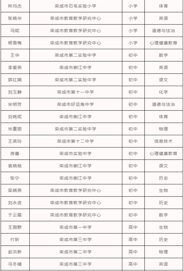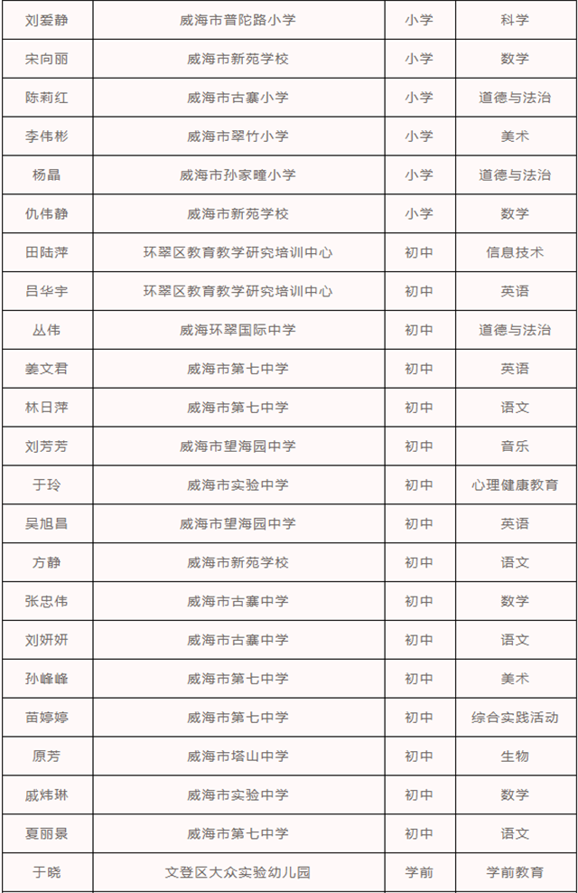 9月10日是我国第37个教师节,为表扬先进事迹弘扬师德新风,市委宣传部、市教育局评选出了“2021年度威海最美教师”“威海市教书育人楷模”“威海市师德建设先进集体”“威海市师德标兵”“威海首批教师志愿服务品牌团队”“威海市第十三届教学能手”“威海市第八届学科带头人”等先进典型,引导广大教师提高师德修养和业务素质,为办好人民满意教育作出更大的贡献。具体名单如下: