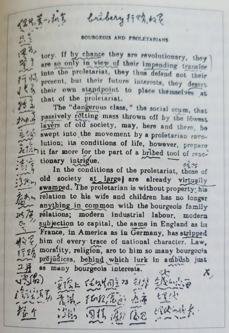 笔者在服务工作过程中也看到过,毛泽东读过的《共产党宣言》英译本从头至尾在版心文字天头、地脚与左右两边空的地方几乎都写满了批注的文字,其中大部分是用中文写的。在读的过程中,对书上的英文单词和短语还不很熟悉或者还没有记住的,他就用铅笔标注出来。当再次阅读的时候,认识的、已经记住的词和短语就顺利过去了,一时还没记住、还没认识的英文单词或者短语,一看写的汉字批注,就即刻回想起来了。这是他晚年学习英语自然形成的一种独特的习惯。在版心每行英文下面还画上了不少的浪线、曲线、横直线等多种符号。从这些所画的种种符号中,我们也可以看出,毛泽东晚年学习英语是很刻苦、是克服了种种困难的。一个耄耋之年的老人,在多种疾病缠身的岁月里,还在专心致志地学习钻研英语,其行动和精神是令人敬佩的。