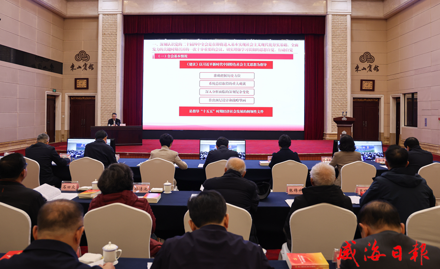 威海新闻网讯 按照省委统一部署,11月25日,学习贯彻党的二十届四中全会精神省委宣讲团报告会在我市举行,市委理论学习中心组进行了集体学习。省委宣讲团成员、省委政法委分管日常工作的副书记郭晓东作宣讲报告,市委书记闫剑波主持,市领导孔凡萍、贾瑞霭、林强等出席。