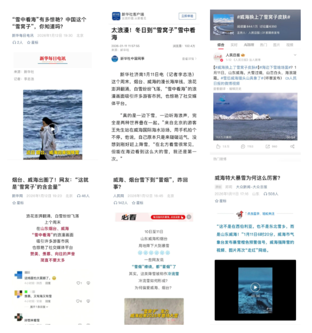近日,威海“雪窝子”含金量热度爆表。漫长的千里海岸线银装素裹,“雪中看海”的浪漫画面不仅吸引了全国各地的游客前来追雪打卡,也惊艳了社交媒体平台,引发主流媒体“刷屏”报道。 新华每日电讯、人民网、新华网、中新社、大众日报等国家级、省级主流媒体刊发主题报道十余篇,其中,人民日报微博#威海换上了雪窝子皮肤#单条阅读量超2000万,新华社客户端刊发《太浪漫!冬日到“雪窝子”雪中看海》单篇阅读量破百万。