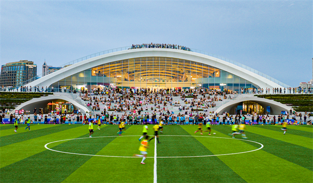 毛宁所提到的绿茵赛场位于至海港湾。其自2025年6月28日启用以来,受到社会各界的广泛关注和点赞,先后荣获《威海手册:全球社区可持续发展报告·2025》优秀案例、2025(第八届)城市更新大资管论坛最佳城市更新表率案例等荣誉。