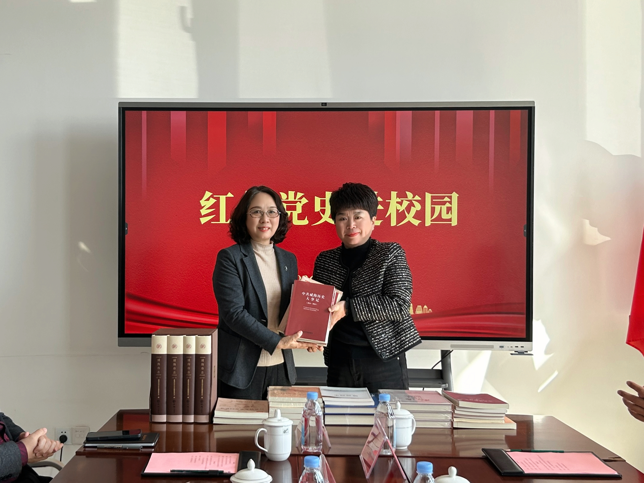 同时,向学校赠送了《中共威海历史大事记(2013—2024)》《红色胶东英烈故事》《红色胶东革命人物故事》《威海市志》等党史史志书籍,为学校开展思政教育、丰富校园文化建设提供了优质学习素材。朱文娟校长表示,将切实用好红色教材、讲好红色故事,把党史学习教育全面融入育人全过程,引导青年学生做到学史明理、学史增信、学史崇德、学史力行,努力成长为担当民族复兴大任的时代新人。 |